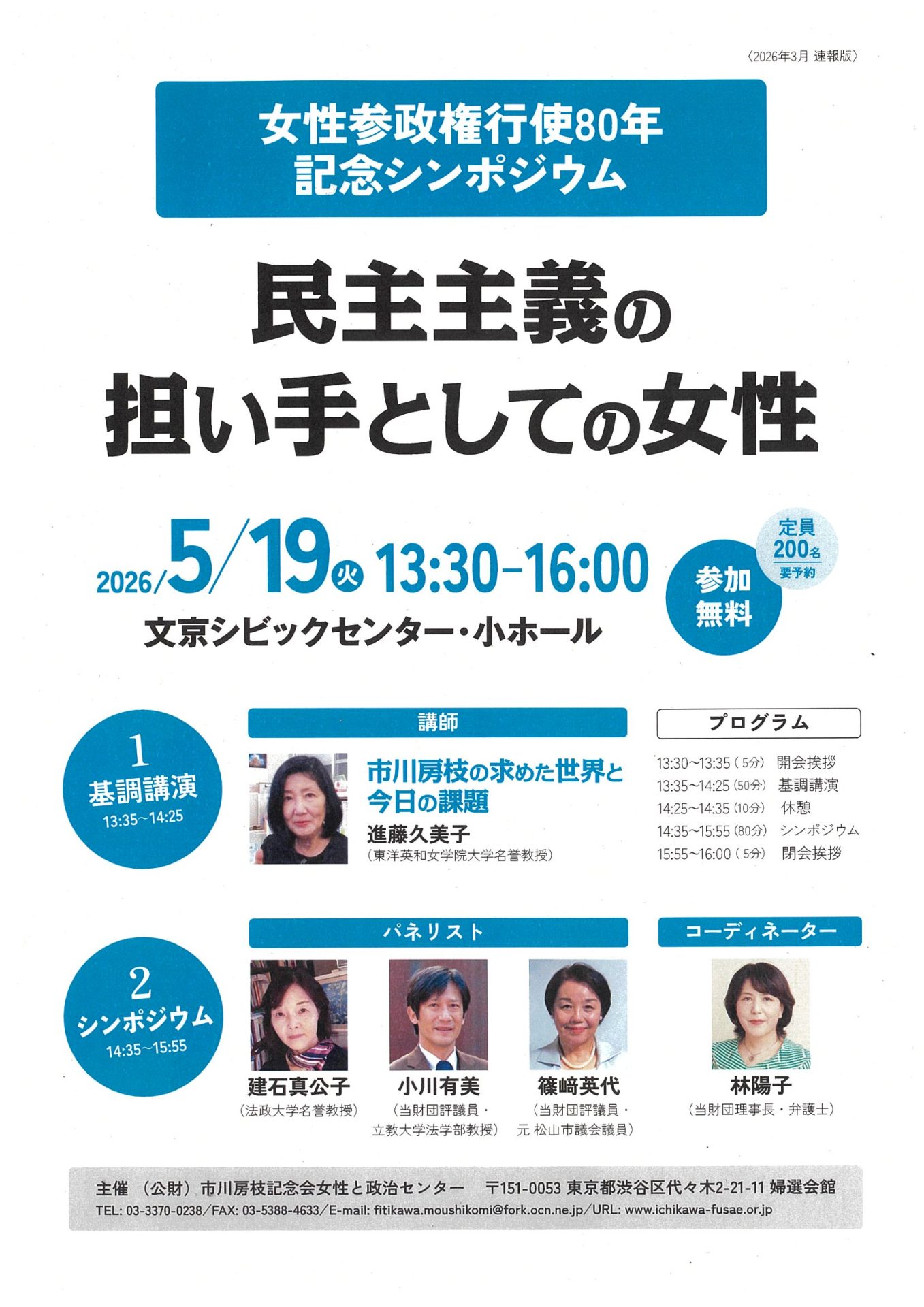 「女性参政権行使80年記念シンポジウム 民主主義の担い手としての女性」(主催(公財)市川房枝記念会女性と政治センタ―)をお知らせします。